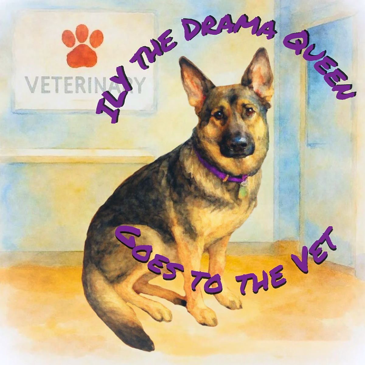 ILY the Drama Queen is an illustration from the children’s book, Ily the Drama Queen Goes to the Vet. Written by Heather and William Turner and illustrated by Heather Turner, ILY is about a dog with the biggest heart and the loudest voice. In this heartwarming and humorous children's book, ILY takes us on a journey to the vet where her emotions run wild... From happy wiggles to operatic protests, ILY feels everything out loud and that's okay. Told in playful rhyme and filled with expressive moments, this story gently shows young readers that it's okay to have big feelings and that love and compassion can conquer any fear.
